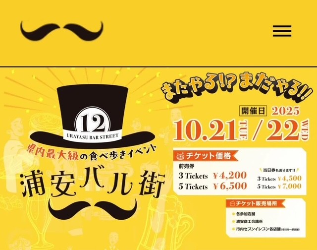 - 10/21 浦安バル街2025 in 新浦安駅前<div>今年で二回目の出店となります。昨年はたくさんの方に来ていただきました。</div><div>今年もお酒にあうおつまみをご用意して待っております。</div><div><br></div><div>14:00~21:00まで</div>