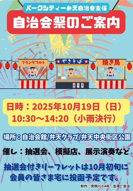 - 10/19 パークシティ弁天自治会祭り<div><br></div><div>今年で二回目の出店となります。</div><div>今年は懐かしの『はしまき』をご用意してお待ちしております。</div><div><br></div><div>10:30~14:20</div><div><br></div>