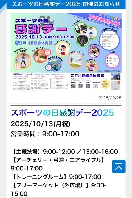- 10/13 江戸川区体育館感謝の日スポーツフェスティバル<div><br></div><div>今年初出店です。</div><div>スポーツの日ならではのいろんなコンテンツがあるようです。</div><div>楽しみです!</div><div><br></div><div>9:00~17:00</div><div><br></div>